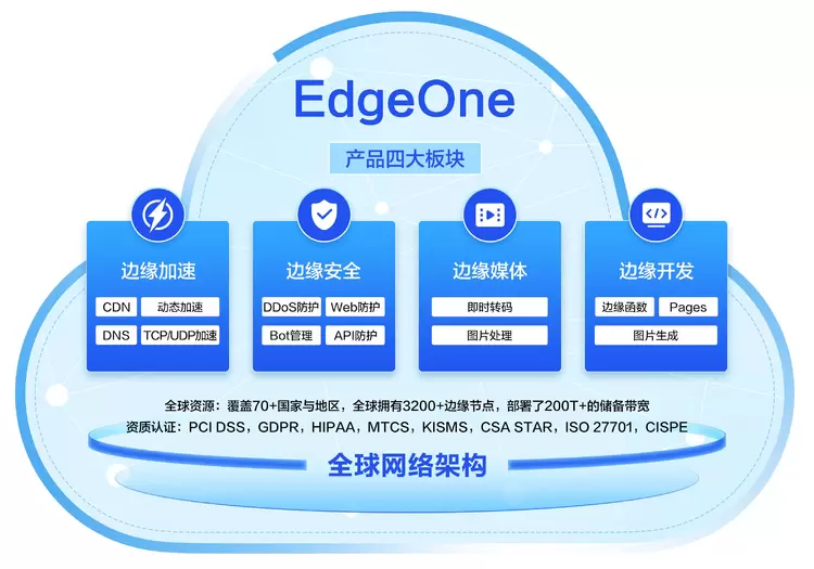 腾讯云边缘安全加速平台 EdgeOne(Tencent Cloud EdgeOne)是国内首款基于全新架构的真正一体化的边缘安全加速平台,提供全面的安全防护、网络与应用性能加速、领先的边缘计算和完善的监控运营分析能力。