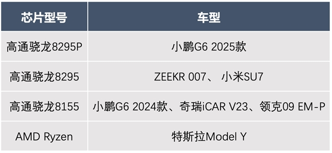当然,影响驾舱体验的另一大关键,还有硬件本身。来看下本次参测的七款车型都用了哪些芯片配置: