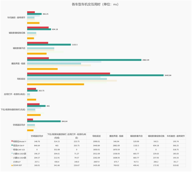 最严重的是导航规划,用时高达3440.84ms,直接创下本轮测试最慢记录,对比榜首极氪007慢了一倍有余。再加上辅助影像打开/切换,座椅调节响应偏慢,多项拉胯导致体验狠狠打折。