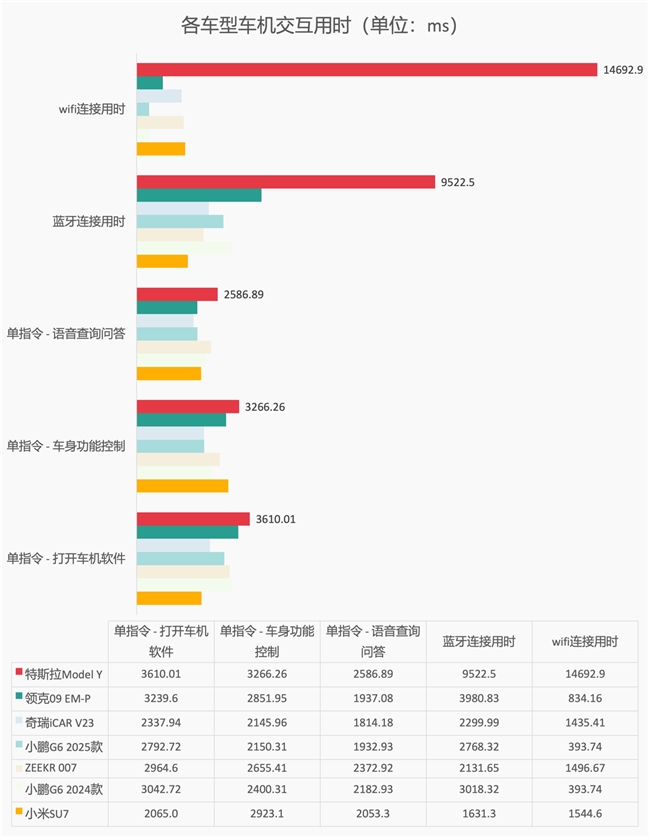 在43项测试中,它几乎没有出现明显拖后腿的项目,整体表现相当稳健,尤其在基础语音唤醒、座椅后视镜调节、Wi-Fi连接等功能上,反应迅速、交互流畅。其中,Wi-Fi连接用时比最慢的特斯拉新款Model Y快了整整14.3s,差距非常直观。