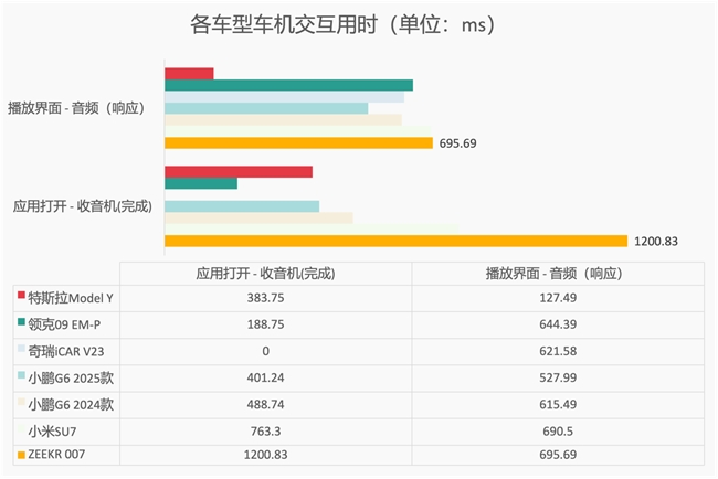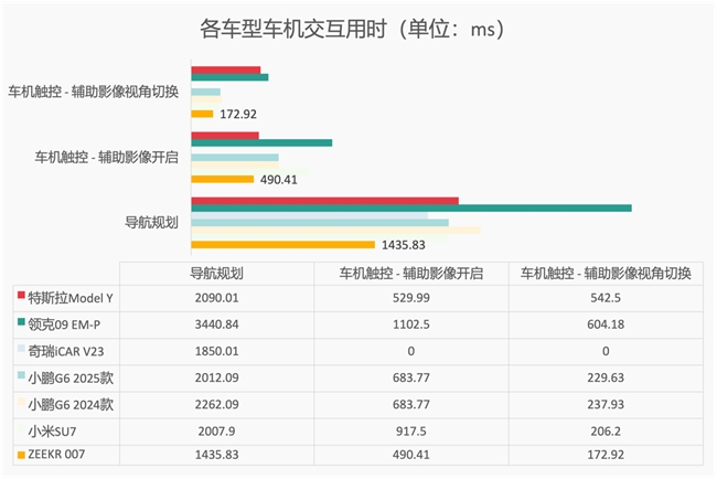 它的优势非常明确——在导航规划、辅助影像打开和切换这些高频场景中,反应速度是七款车型中最快的。特别是在导航指令下达到路线生成的环节,极氪007做到了1435.83ms,是这次测试里表现最亮眼的单项。