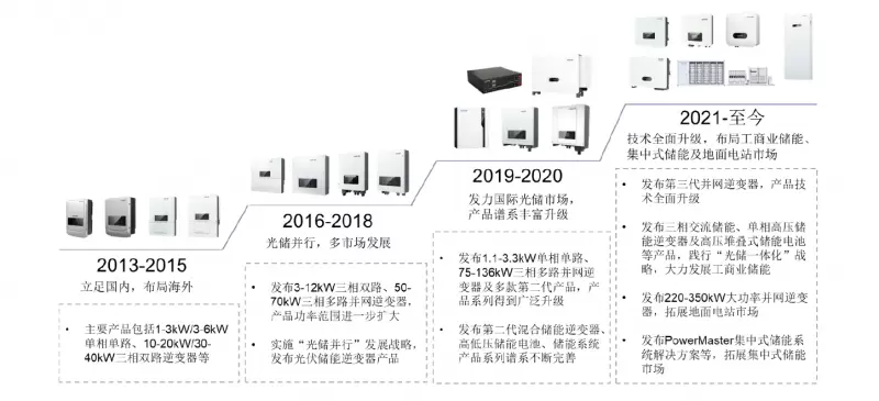 公司进入逆变器行业后,并没有一开始就进入集中式逆变器市场,而是从小功率的分布式逆变器切入市场,因为小功率逆变器技术含量高,但投入较低,产品主要面向个人和工商业,只要解决了技术和产品制造问题后,找个经销商就不愁卖货了。到了2015年,洞察到储能的广阔需求后,公司开始进入储能逆变器行业。