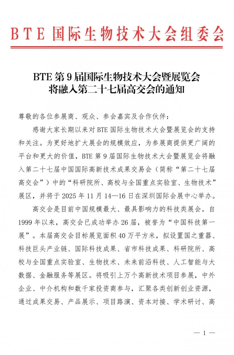 感谢大家长期以来对BTE国际生物技术大会暨展览会的支持和关注。为更好地扩大展会的规模效应,为参展商提供更广阔的平台和更大的价值,BTE第9届国际生物技术大会暨展览会将融入第二十七届中国国际高新技术成果交易会(简称“第二十七届高交会”)中的“科研院所、高校与全国重点实验室、生物技术”展区,并将于2025年11月14—16日在深圳国际会展中心举办。
