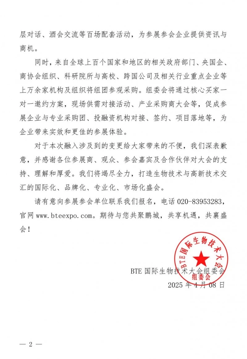对于本次融入涉及到的变更给大家带来的不便,我们深表歉意,并感谢各位参展商、观众、参会嘉宾及合作伙伴对大会的支持、理解和厚爱。我们将竭尽全力,打造生物技术与高新技术交汇的国际化、品牌化、专业化、市场化盛会。
