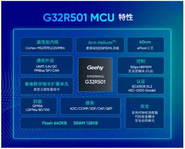 其中,G32R501实时控制MCU,采用Cortex-M52双核CPU,内置单/双精度FPU,支持Arm HeliumTM矢量扩展技术,可将机器学习(ML)性能提升5.6倍,DSP数字信号处理性能提升2.7倍,有效降低了MCU内核的实时负载,从而降低了系统的整体复杂度和软件开发难度,减少开发成本、提升产品效益。G32R5系列还通过支持自定义数据通路CDE接口,可扩展极海自主研发的紫电数学指令扩展单元,在指令集层面支持三角函数、傅里叶变换、复杂数学等多种数学计算加速,大幅缩短数学计算时间、降低CPU访问延时,从而提升系统整体实时性和智能化。
