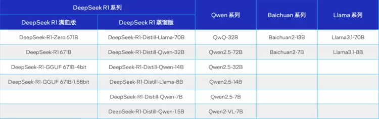 像这样的配置,不光能够很好地支持DeepSeek R1系列,同时还与Qwen、Baichuan、Llama等多个开源模型兼容适配。