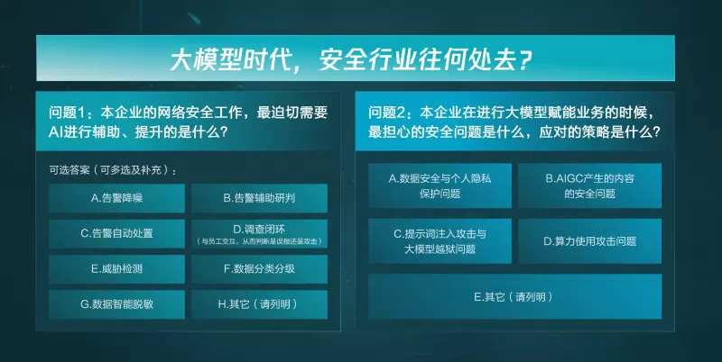 第三组代表炼石网络创始人&CEO、腾讯云 TVP 白小勇表示,对于第一个问题我们认为最迫切需要 AI 辅助的是D、F、H(调查闭环、数据分类分级以及编写报告)。企业在提升网络安全工作中,首先应评估哪些环节消耗大量的人工和成本,并选择合适的大模型来实现增效降本。而对于前三个和告警相关的选项,我们选择了B(告警辅助研判)。此外,我们认为文档撰写也是企业的一个迫切需求,占比应该超过50%。