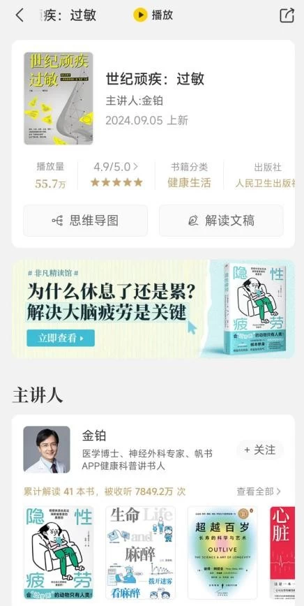人生如海,好书是帆。在花粉过敏高发的季节,帆书APP不仅为我们提供了知识的指引,更赋予了我们守护健康的智慧。通过聆听这些书籍,我们逐渐明白,过敏并非不可战胜,而是需要我们用心去应对。
