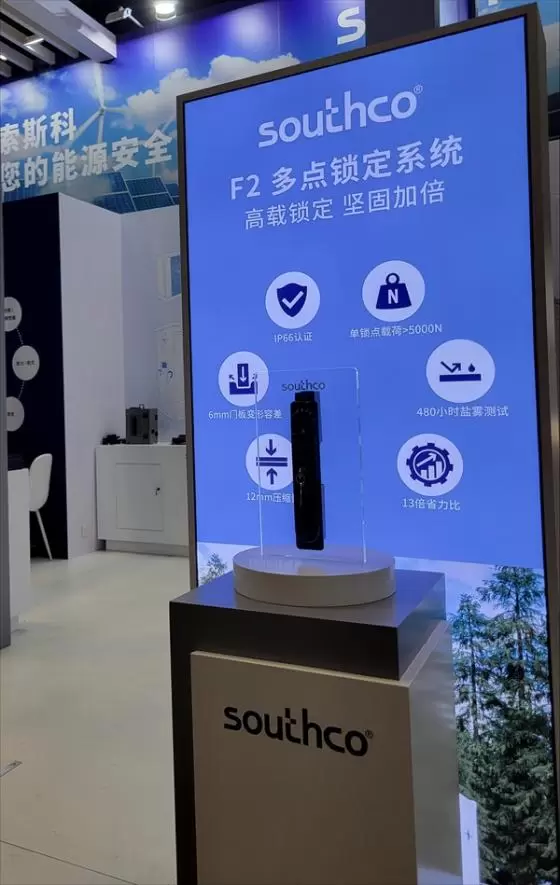 随着储能产业进入规模化发展新阶段,储能箱体的大容量化、高集成化已成为技术演进的核心方向。系统容量的几何级增长对设备安全性能提出了严苛要求,特别是在结构防爆与密封防护领域呈现显著升级趋势。当单体储能单元容量提升至MWh级后,其热失控风险呈指数级增长,要求箱体结构必须具备更强的爆炸冲击抵御能力。同样地,对其零部件的防爆要求也相应提高。为解决这样的应用难题,索斯科在展会上展示了专为大容量储能设备设计的高强度防爆锁定新品–F2多点锁定系统。其核心特点包括: