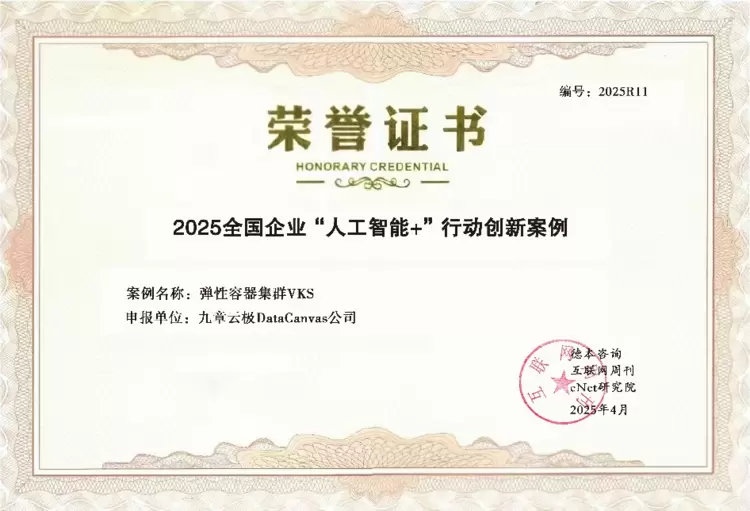 近日,中科院《互联网周刊》联合eNet研究院、德本咨询共同发布了【2025全国企业“人工智能+”行动创新案例TOP100】榜单。作为国内AI基础设施领军企业,九章云极DataCanvas公司自主研发的“弹性容器集群VKS”,以灵活的拓展能力、高安全性和低成本等核心优势成功入选该榜单,成为推动“人工智能+”战略落地的重要标杆。