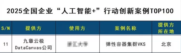 九章云极DataCanvas入选2025全国企业“人工智能+”行动创新案例TOP100
