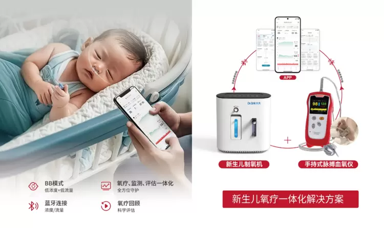 在新生儿健康领域,氧大夫推出"新生儿智能氧疗+精确生命监测"一体化解决方案。经典产品新生儿手持血氧仪与爆款新品智能制氧机的创新组合,通过智能APP实现数据互联,构建起覆盖"生命监护-氧疗支持-康复护理"的全周期管理平台。该方案可为合作伙伴切入高端医疗设备市场提供技术护城河