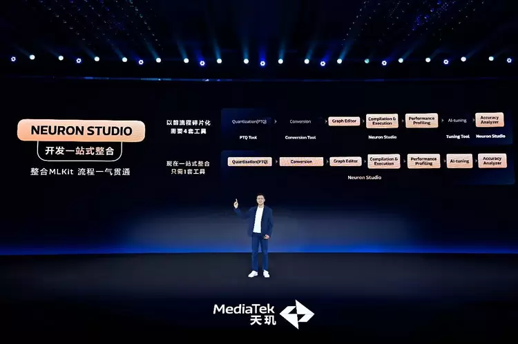 而联发科的AI应用全流程开发工具Neuron Studio提供了最优解。Neuron Studio可针对模型到应用,提供一站式、全链路、自动化的开发协助,不仅让AI应用开发的全流程可视化,更带来整个多种工具的一站式开发能力,还支持神经网络自动化调优和跨模型全链路分析功能,针对AI应用开发的三大痛点逐个击破。