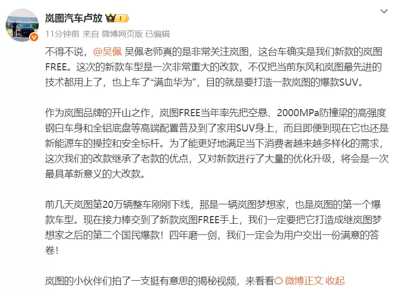4 月 11 日,岚图汽车 CEO 卢放在微博上发布重要消息,官宣网络上热议的一款伪装车正是即将发布的新款岚图 FREE,并证实了网友猜想,新车将搭载“满血华为”。卢放在博文中强调,此次改款的新款岚图FREE将是一次非常重大的改款,预计在华为赋能之外,还将融合东风和岚图的最新技术,旨在打造继岚图梦想家之后的第二款爆品。