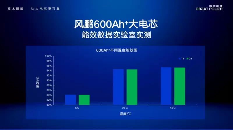 根据实验室实测数据,目前阶段风鹏600Ah+大电芯已实现全温域高能效,在5℃时,能效超84%;25℃时,能效超94.5%;45℃时,能效接近96%。同时,随着研发体系持续迭代,风鹏大电芯能效数据有望持续跃升。