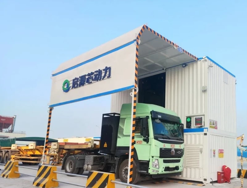 深圳港大铲湾码头首座新能源电动重卡充换电站由启源芯动力在2024年末建成投产,具有全自动快速换电、智能交互、灵活投建、多重消防等优点,为首批30台新能源拖车(牵引车)进行快速便捷的充换电服务,满足港口24小时不间断生产的需求。