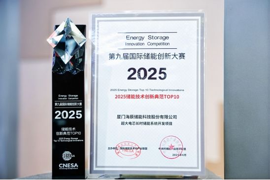 4月10日,第13届储能国际峰会暨展览会(ESIE2025)在北京隆重开幕,同期举办第九届国际储能创新大赛颁奖典礼,海辰储能基于超大电芯长时储能系统开发项目和储能预制舱及储能系统,分别摘获“2025储能技术创新典范TOP10”和“2025储能专利创新典范TOP5”两项大奖。