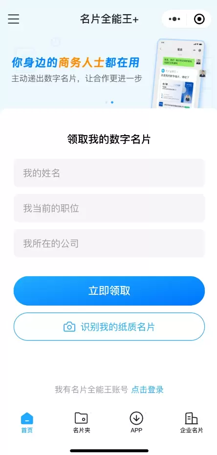 名片全能王不仅实现了纸质名片的数字化替代,更在信息传递效率、人脉网络拓展及个人品牌塑造上实现了质的飞跃。新用户只需简单三步——填写姓名、职位、公司,并授权手机号,即可免费拥有一张专属的数字名片。这张名片不仅是个人信息的载体,更是商务形象的展示窗口,让每一次交流都充满专业与魅力。