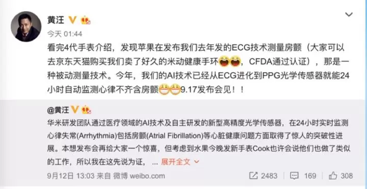 今天凌晨,苹果秋季新品发布会上,AppleWatch4正式登场,作为重头戏介绍的ECG功能,让随时随地的心电图测量成为可能,这也让众多现场观众欢呼连连,但让大家失望的是,国内版的AppleWatch4的心电功能直接被阉割。不过,随后华米科技创始人、董事长兼CEO黄汪却表示,苹果ECG功能早已经出现在一年前的产品AMAZFIT米动健康手环中,即将发布的AMAZFIT新品,将AI技术和PPG结合,实现24小时监测。