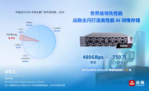 2025 年 4 月 14 日,国际数据公司 IDC 发布了《中国软件定义存储(SDS)市场季度跟踪报告,2024Q4》。报告数据显示,2024 年度,焱融存储凭借领先的产品性能和广泛的市场落地,在 SDS 文件存储市场实现同比增长 48.4%,增速稳居行业第一,市场份额持续攀升。同时,焱融全闪存储一体机在 AI 训练及推理场景中的市场份额大幅提升,在 SDS 全闪市场排名第四,充分凸显其在 AI 场景中的强劲竞争力。
