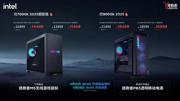 刃7000K超能版AI元启推出搭载英特尔酷睿Ultra 9 275HX处理器的两种配置组合,其中RTX 5070Ti版本国补价14,499元,RTX 5070版本国补价11,499元。面向更高性能需求的刃9000K AI元启则提供Ultra 9 285K+RTX 5070Ti的19,499元旗舰配置,以及Ultra 7 265K版本的16,999元主流选择,为专业用户构建多元性能解决方案。全系台式机将于4月15日20:00启动预约,4月28日10:00点正式发售,购机即赠拯救者M5无线游戏鼠标,晒单可额外获得PB3透明移动电源。