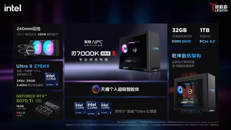 除了拯救者Y9000P 2025至尊版AI元启之外,直播同步发布了联想拯救者台式机新品刃7000K超能版AI元启,其搭载英特尔酷睿Ultra 9 275HX处理器,采用无顶盖直触散热设计,全新设计的垂直风道机箱配备5组12cm风扇系统,底部直吹设计配合850W整机解热能力,在240mm水冷系统的加持下,可完美承载600W RTX 5070Ti显卡与253W CPU的双重火力输出。