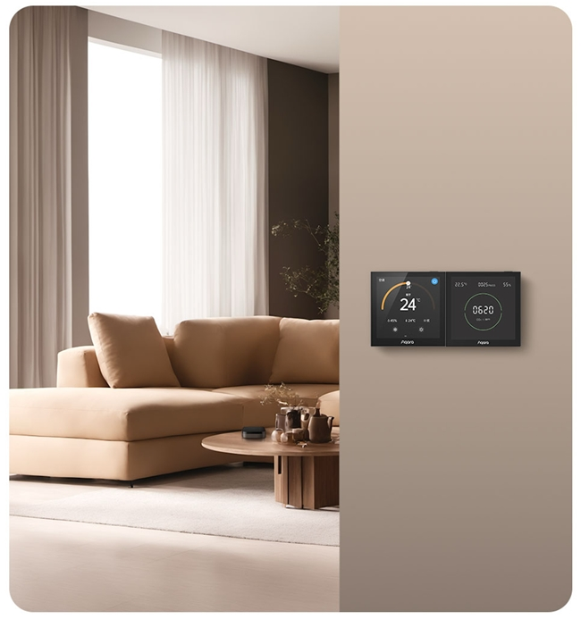 结合 Aqara 多种智能传感设备及 AI 算法,自动调控暖通系统运行。例如,搭配空气监测面板 S1,当室内 CO₂ 浓度超过 800ppm 时自动开启新风系统,保障空气清新;联动温湿度传感器,将湿度稳定维持在 40%-60% 区间,全面告别干燥与潮湿困扰。