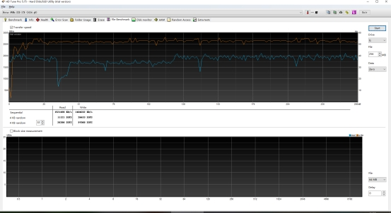 对于摄像师和视频剪辑师来说,传输几十甚至上百GB的文件是家常便饭的事情,使用HD Tune Pro对朗科这款SSD进行大容量压力测试,首先进行64GB的写入测试,可以看到写入速度还是比较稳定的,速度基本稳定在2300-2900MB/s。