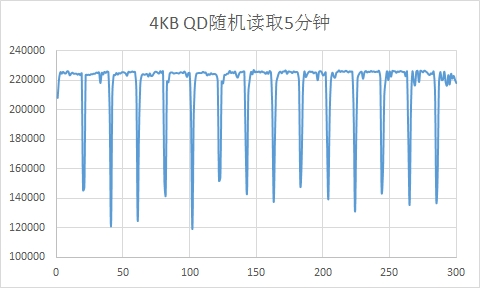 使用Iometer测读写试软件对这款SSD进行五分钟的4KB QD32的随机读取测试,从测试结果可以看到每秒的读取次数稳定在220K左右,这读取性能还是比较稳定的。
