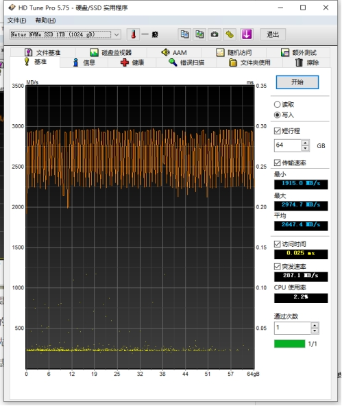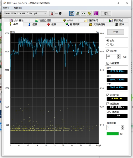 同样使用HD Tune Pro对朗科这款SSD进行64GB的读取测试,读取速度基本稳定在2750MB/s,虽然速度有点波动,但是整个过程的平均速度也高达2645MB/s。