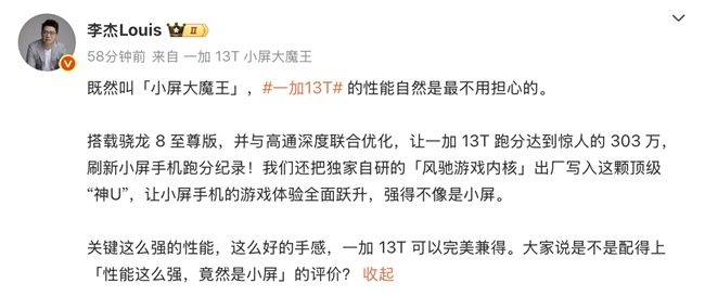 一加中国区总裁李杰表示,“一加 13T 搭载骁龙 8 至尊版,并与高通深度联合优化,把独家自研的「风驰游戏内核」写入芯片底层,让小屏手机游戏体验也全面跃升。这么强的性能,这么好的手感,一加 13T 可以完美兼得。”