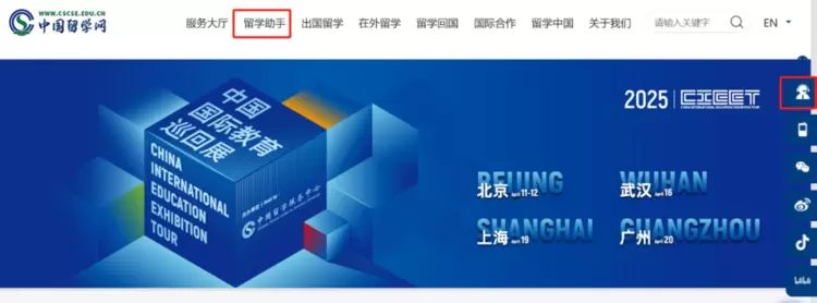 中国留学网页面的“出国留学助手”入口