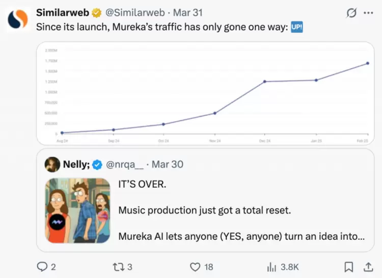 全球权威流量平台Similarweb数据显示,自2024年8月Mureka上线以来,全球访问量持续走高。根据AI产品榜2025年3月全球流量数据,Mureka全球3月访问量增速高达86.54%,位列全球AI音乐市场第一、3月全球AI产品增速榜Top15,月访问量达333 万。