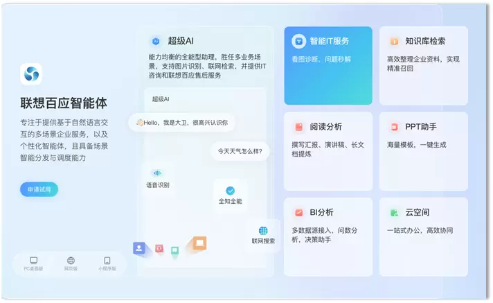 联想从中小企业需求出发,针对中小企业最为关心的开源、提效、降本三大难题,通过AI营销、AI办公和IT运维三大核心应用,为其量身定制了一套 “组合拳”。