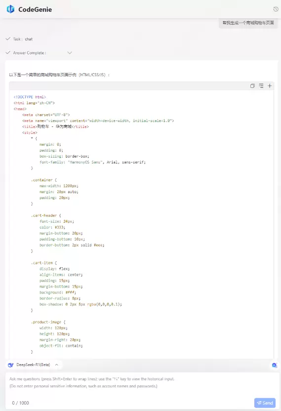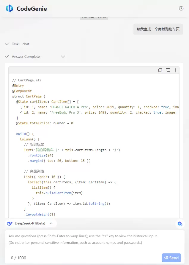 随着DeepSeek模型使用RAG能力增强之后,CodeGenie接入的DeepSeek模型在鸿蒙领域上更专业、更准确。无需开发者在使用过程中强制加上“鸿蒙场景下”或“ArkTS中”等限定词,也能精准理解意图并输出鸿蒙技术栈内相应的专业知识,为鸿蒙开发场景带来了前所未有的智能问答体验。