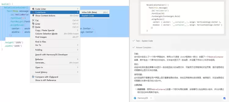 针对开发过程中常见的代码问题,CodeGenie此次新增了代码解释功能,进一步降低开发门槛。用户在选中代码片段后,AI即可自动分析代码结构,提供直观、易懂的解释,帮助开发者快速理解复杂逻辑与语法,尤其适合初学者或对ArkTS语言尚不熟悉的开发者,加速其上手与成长。