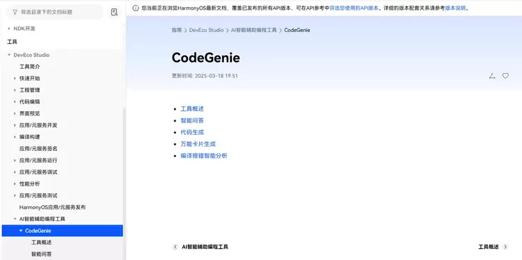 进入“HarmonyOS开发者官网”,点击“开发”——>“开发文档”,点击左侧“DevEco Studio”——>“AI智能辅助编程工具”——>“CodeGenie”获取技术文档、使用指南,快速上手开发,体验AI带来的高效开发新模式。
