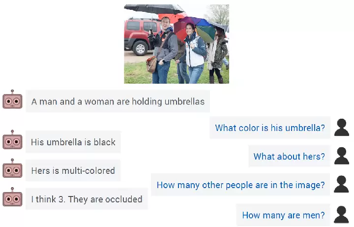因此任务要求AI不仅需要对图像进行理解,还要根据对话的上下文进行分析来推断其中的主题以及指代关系。同时该任务生成的回答更加偏向于自然语言,更方便人的理解。此任务帮助AI机器人在人机交互,视觉辅助等领域有重要的意义。