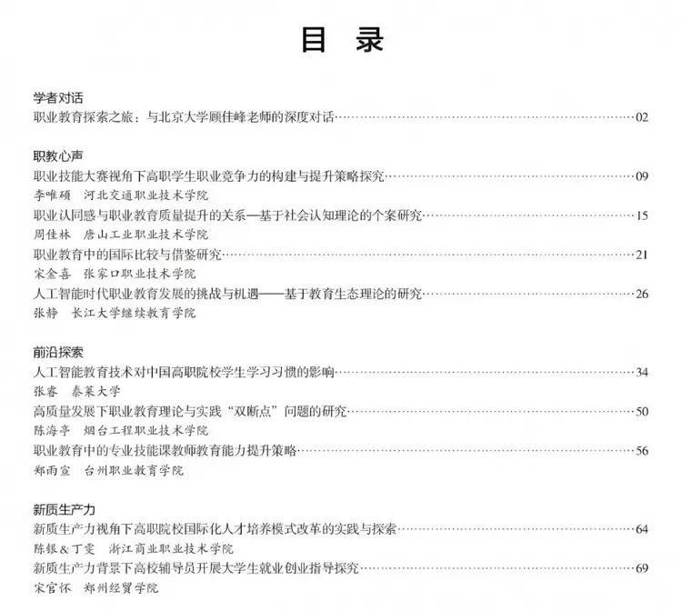 依托《职业教育探索》期刊平台,组织“全球职教数字化转型”专题征稿,收录来自海内外的研究成果,推动职业教育理论与实践的全球对话。《职业教育探索》第一辑不仅收录了学者的最新研究,也保留了高职院校一线教师和学生的声音,这一创新模式受到了高职院校师生的广泛欢迎。