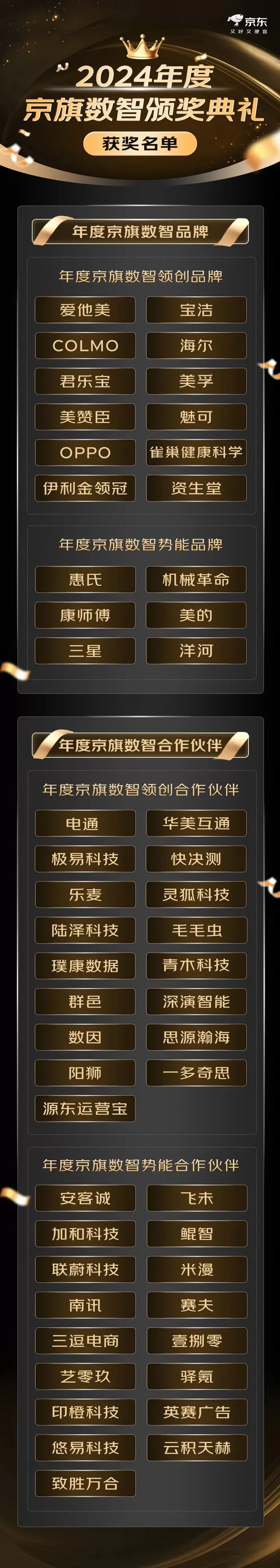 2024年,不少品牌及合作伙伴应用京东数智能力挖掘生意增量、突破经营瓶颈,积极探索数智化时代下的增长新解法,在京东实现可量化、可追踪、可优化的生意成功。2024年度京旗数智颁奖典礼在大会上隆重举行,超50个品牌及合作伙伴脱颖而出,他们通过更清晰地洞察消费者需求,更精准地匹配经营策略,更智能搭建营销数据链路,为行业打开新的营销视野和思路。
