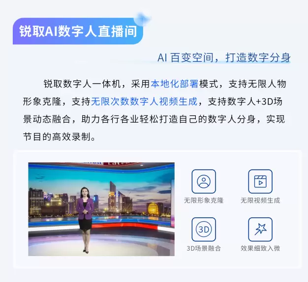 通过将数字人与3D场景动态融合,锐取AI数字人直播间以AI技术颠覆传统录播方式,构建起虚拟的“真实”场景,以AI数字人替代真人直播,从而真正实现24小时乃至全年不间断互动,适用于节目录制、业务咨询等丰富场景,以AI数字人开启全新数字互动体验。