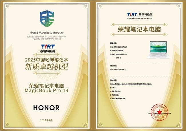 4月18日,在中国消费品质量安全提升系列行动2025启动暨2025消费品行业系列研究报告发布活动上,荣耀高性能轻薄笔记本MagicBook Pro 14凭借超长续航、离电通电同性能以及领先的AI交互体验,获得“2025中国轻薄笔记本新质卓越机型”,是入选消费电子类产品中唯一的便携式PC。