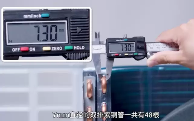 作为省电静音空调的新标杆,科龙静省电Max挂机在硬件配置和用料方面实现了远超同行的跨越式提升。外机搭载了行业Top3的凌达压缩机,在9.8cc大排量的基础上将冷热效率提升了11.4%,配合500级三花电子膨胀阀精准控流,减少能耗浪费,用久依旧省电。更值得关注的是,这款省电静音空调外机采用了48根7mm直径的双排紫铜管,换热效率提升30%,与目前行业同等价段采用的5mm单排黄铜相比,紫铜的含铜量更高,配合43.4mm超厚翅片,在高温环境下仍能保持稳定的换热效率。