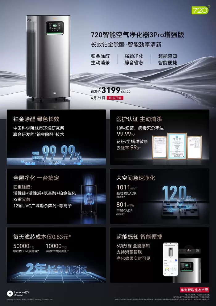 720健康科技正式发布与华为智选联合开发的旗舰新品华为智选 720智能空气净化器3Pro增强版(以下简称720空净3Pro增强版),并近日将在在华为商城、华为京东自营官方旗舰店、天猫华为官方旗舰店全面开售,零售价4199元,首发价3199元。