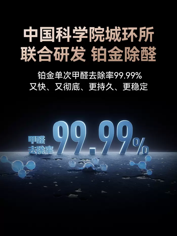 【1】铂金单次甲醛去除率99.99%:试验数据来源于中国科学院城市环境研究所实验室数据。