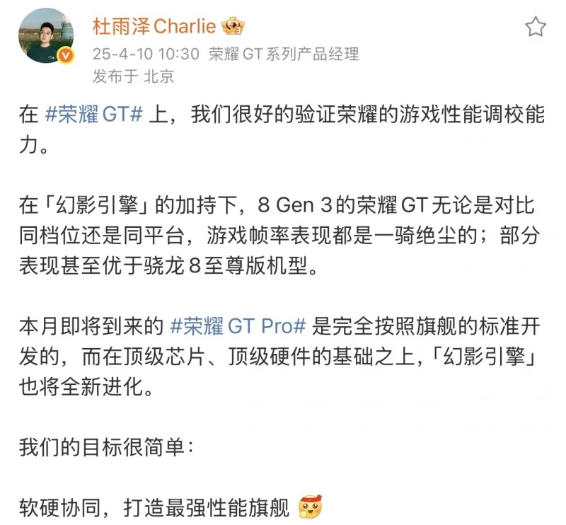 荣耀GT Pro首发骁龙8至尊领先版,性能体验领跑行业