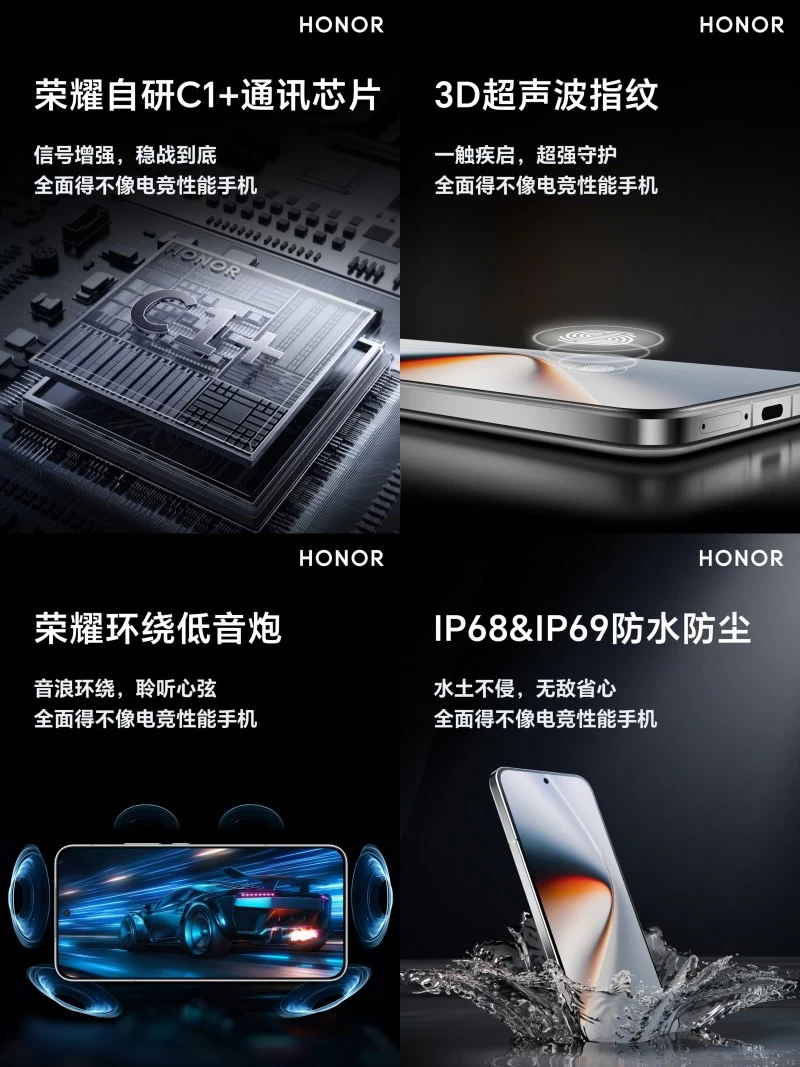 此外,根据官方及外围多方爆料,荣耀GT Pro还将搭载一块144Hz绿洲护眼电竞屏,瞬时触控采样率高达2700Hz,为电竞级触控带来跨越式升级。同时还有双1216超大立体声扬声器、九大荣耀绿洲护眼特性、3D超声波指纹、荣耀巨犀玻璃、双频GPS三频北斗、HONOR C1+自研射频增强芯片、荣耀优速通、IP68&IP69防水防尘,支持雅顾人像等配置和体验。