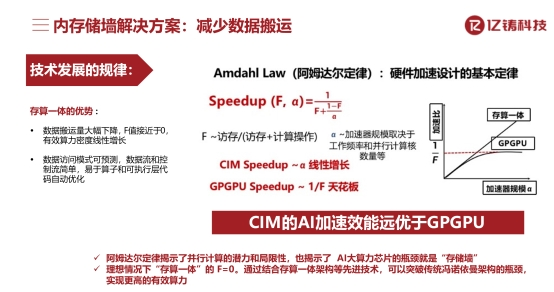 针对这一行业痛点,亿铸科技创新性地提出了全数字存算一体架构解决方案。该架构通过将存储与计算单元深度融合,优化数据处理流程,为提升计算效率提供了新的技术路径。阿姆达尔定律揭示了并行计算的潜力和局限性,据熊大鹏博士介绍,存算一体架构可以将数据搬运量降低90%以上,使F值趋近于0,从而显著提升有效算力密度。在实际应用中,亿铸科技的存算一体AI大算力芯片能够带来1-2个数量级的能效比提升。