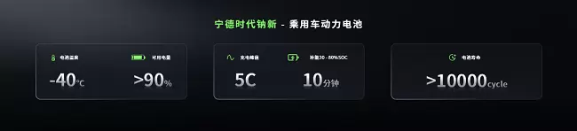 钠新乘用车动力电池的能量密度达175Wh/kg,为当前全球钠电最高,比肩磷酸铁锂电池;支持峰值5C的充电速率和500公里续航,实现超1万个循环的寿命,同时大幅降低维护成本。在安全性上,钠新电池从材料本征层面消除电池热失控中的助燃因素,实现电池安全从“被动防御”到“本质安全”的跨越式突破。