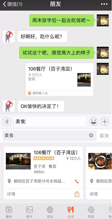 以后,作业再多也不用发愁,搜狗输入法智能分享帮你一起解决难题,随时随地都是学习的好帮手,勤学好问的你的成为尖子生指日可待。同学周末聚餐再也不用再纠结吃什么,用搜狗输入法智能分享搜索一下,一网打尽周围好评美食,快速分享给同学们沟通作出选择,一起度过一个没有“聚餐分歧”的欢乐周末!